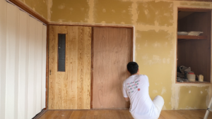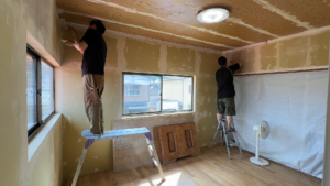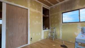 計画しているときは壁も白ペンキで塗ろうかと考えていたのですが、実際に見てみるとパテが目立っちゃうかなと思い部分部分をぬるようになりました。
